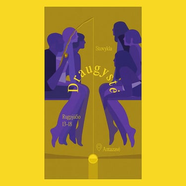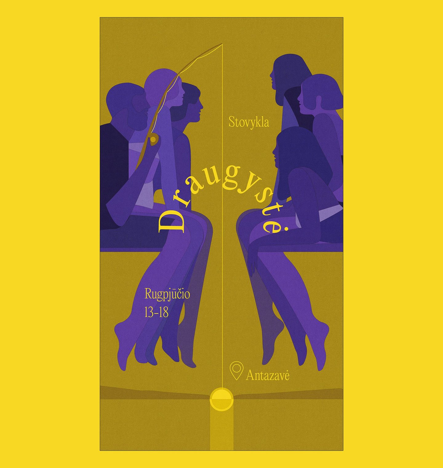 Artwork for annual summer camp “Friendship” (Draugystė), during which there will be all kinds of connection points of friendship from jumping into water school, nature lessons to theatre in front of the lake. Friends fishing the sunset felt the right way to illustrate the event.