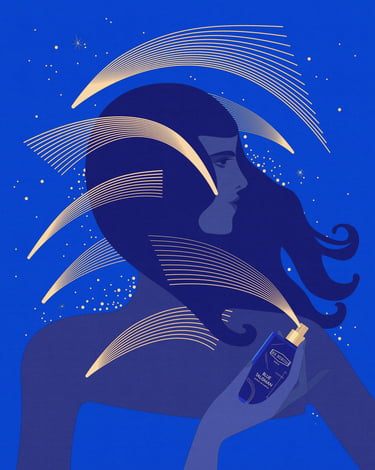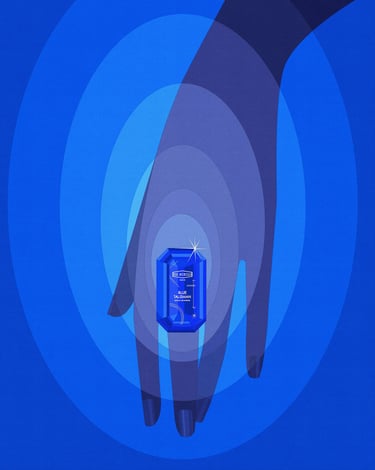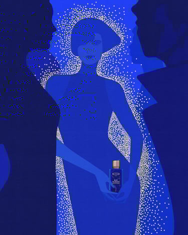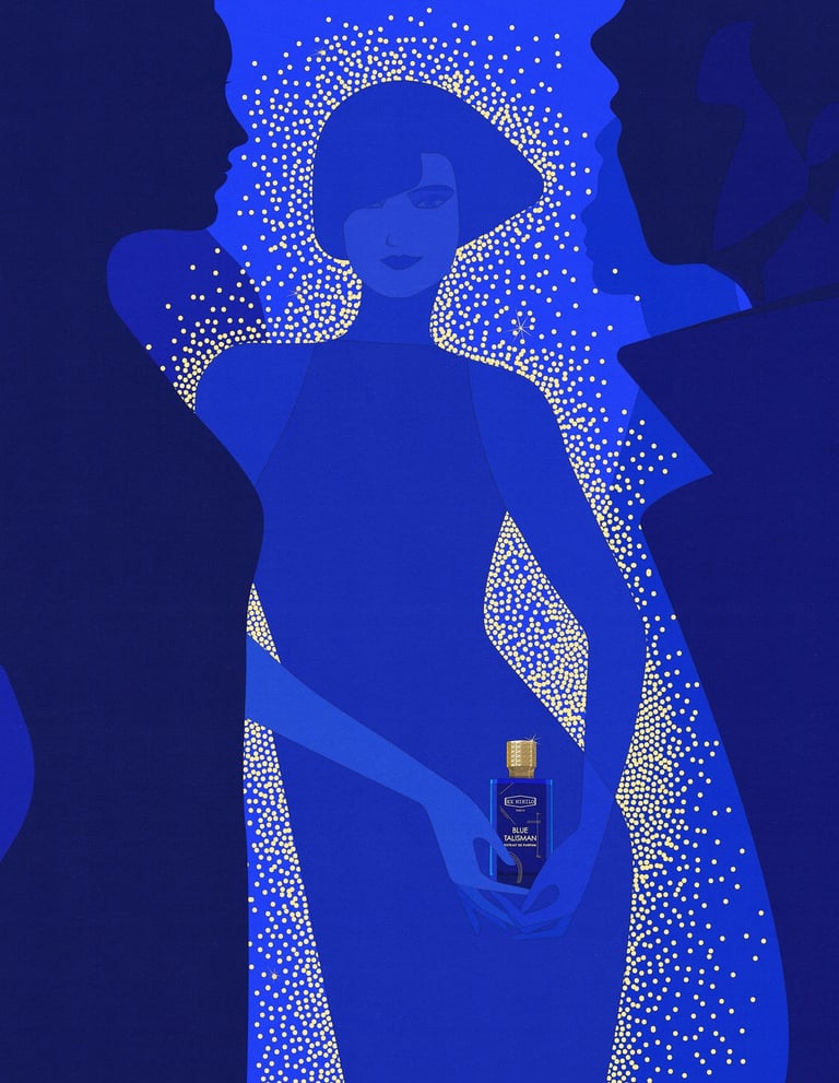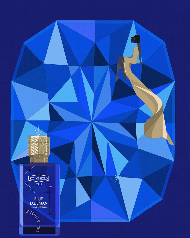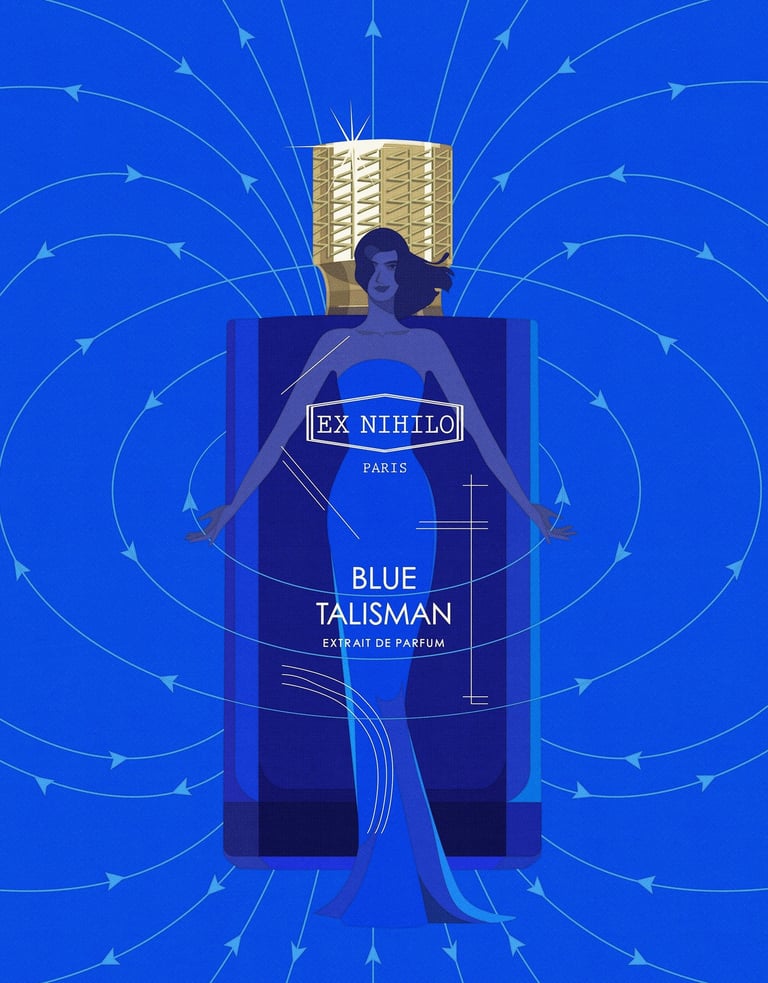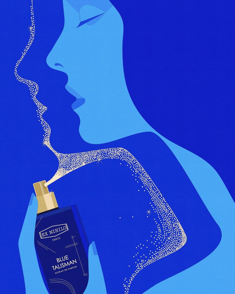 This time, the illustrations were created for EX NIHILO PARIS – Blue Talisman Eau de Parfum, in collaboration with parfumerie Crème de la Crème. The fragrance itself embodies spiritual energy, expressed through the subtle freshness of ginger, softened by abstract musky and ambery notes. My goal was to translate this essence into visuals - creating an atmosphere where one feels enveloped by luck, charm, protection, and spiritual abundance.
